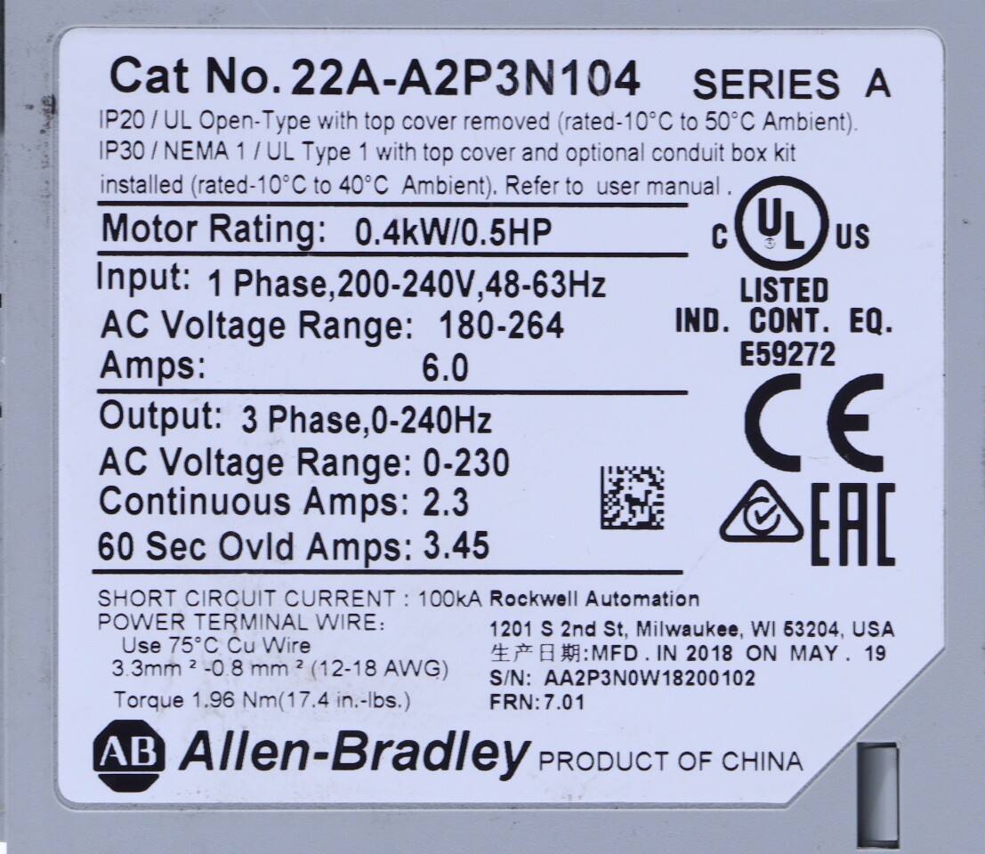 * ALLEN BRADLEY POWERFLEX 22A-A2P3N104 SERIES A VARIABLE FREQUENCY DRIVE