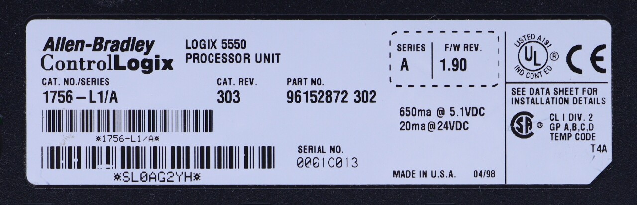 * ALLEN BRADLEY CONTROLLOGIX 1756-L1/A LOGIX 5550 PROCESSOR UNIT