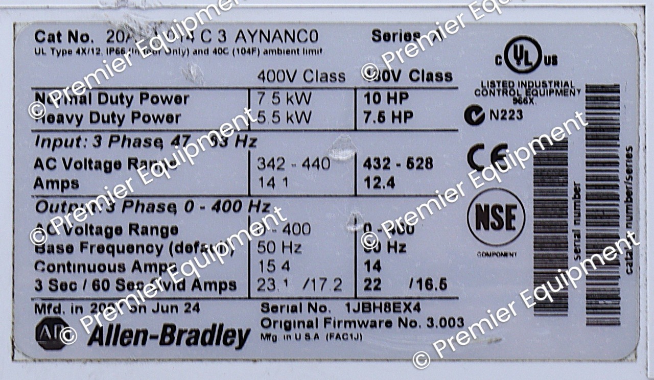 ALLEN BRADLEY 20AD014C0AYNANC0 SER A POWERFLEX 70 AC DRIVE 10HP FW 3.003480 VAC3 PHASE14 AMP7.5 KW10 HPLISTED FOR PARTS. NO REFUNDS, NO RETURNS.