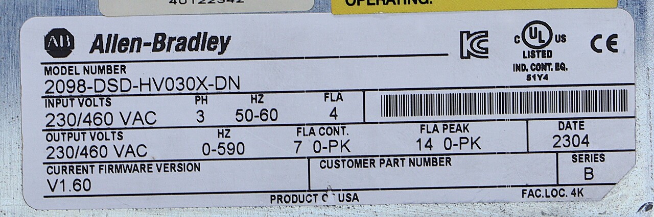 For parts, no refunds, no returns.ALLEN BRADLEY 2098-DSD-HV030X-DN SER B SERVO DRIVE ULTRA 30003 KW230-480 VAC50/60 HZ7-14 AMPS12/24 VDC SUPPLY