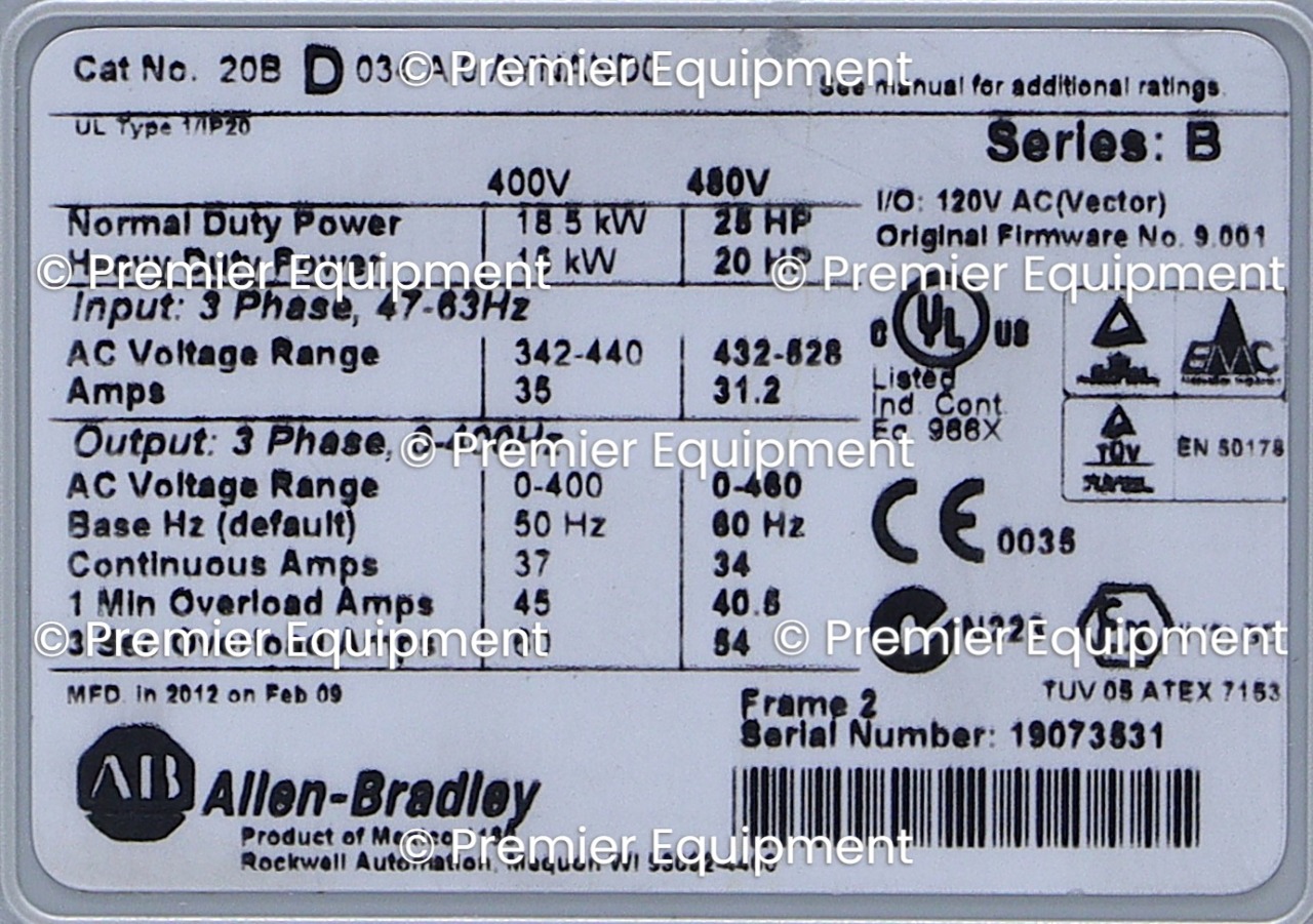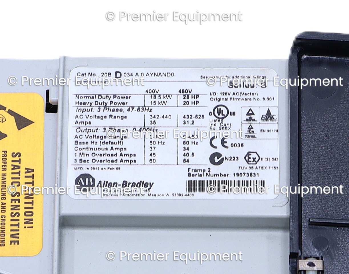 ALLEN BRADLEY 20BD034A0AYNAND0 SERIES B POWERFLEX 700 25 HP AC DRIVESER B FRN 9.001AIR COOLED480 VAC60 HZ3 PHASE34 AMP25 HPFRAME 2
