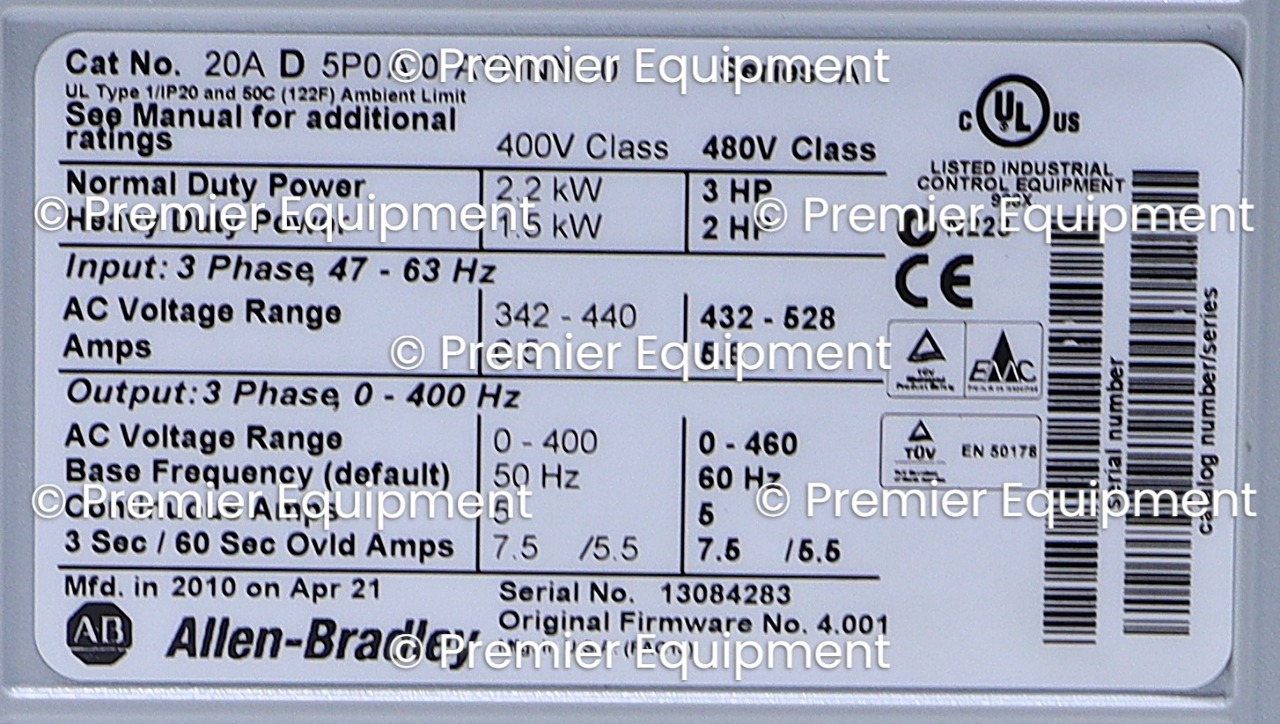 Listed for parts. No returns, No refunds. Nice physical condition.480 VAC3 PHASE5 AMP2.2 KW3 HP