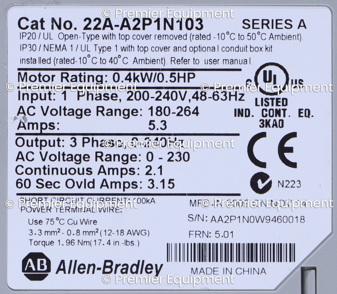 * ALLEN BRADLEY 22A-A2P1N103 SER A POWERFLEX VARIABLE FREQUENCY DRIVE