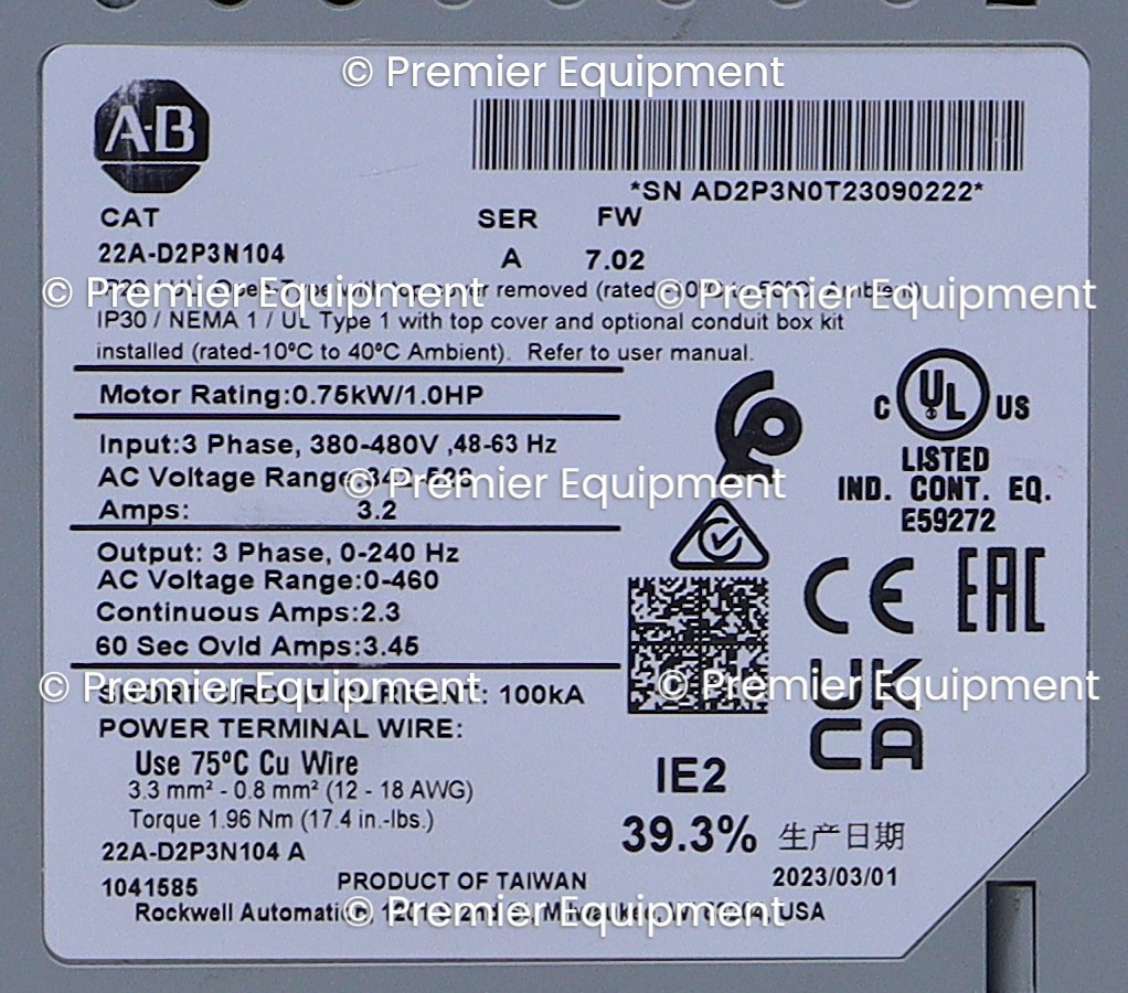 * ALLEN BRADLEY 22A-D2P3N104 /A FRN 7.02 POWERFLEX VARIABLE FREQUENCY DRIVE