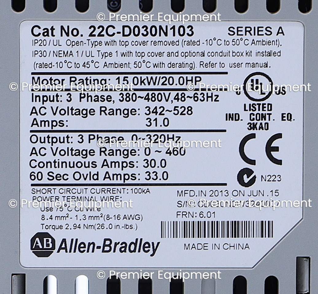 * ALLEN BRADLEY 22C-D030N103 SER A POWERFLEX 400 20HP 15KW AC DRIVE
