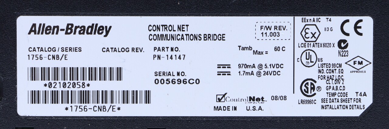 * ALLEN BRADLEY 1756-CNB/E CONTROL NET COMMUNICATIONS BRIDGE