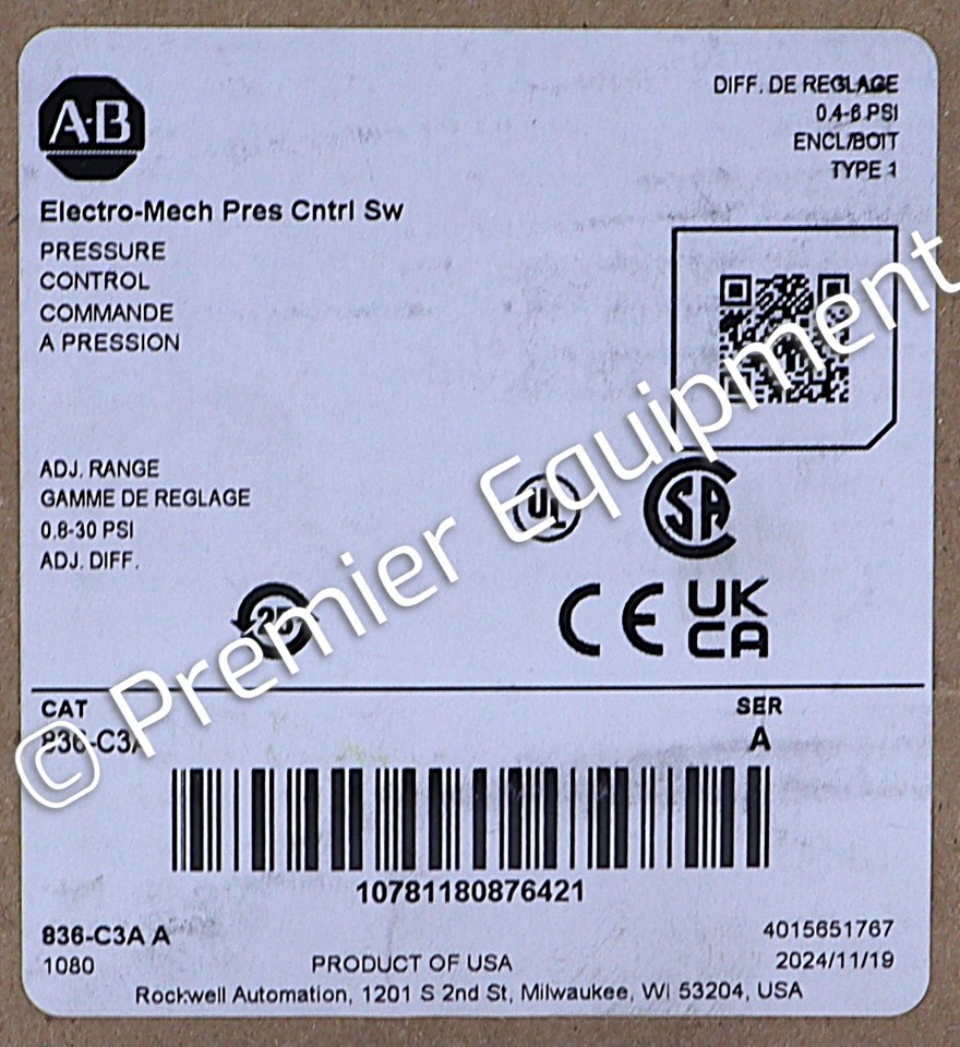 ALLEN BRADLEY 836-C3A SER A PRESSURE CONTROLGENERAL INDUSTRIALDEVICE STYLE CEXTERNAL COPPER ALLOY BELLOWSTYPE 1 ENCLOSURENO MODIFICATIONSMOUNTABLECOMES IN FACTORY OPENED BOX