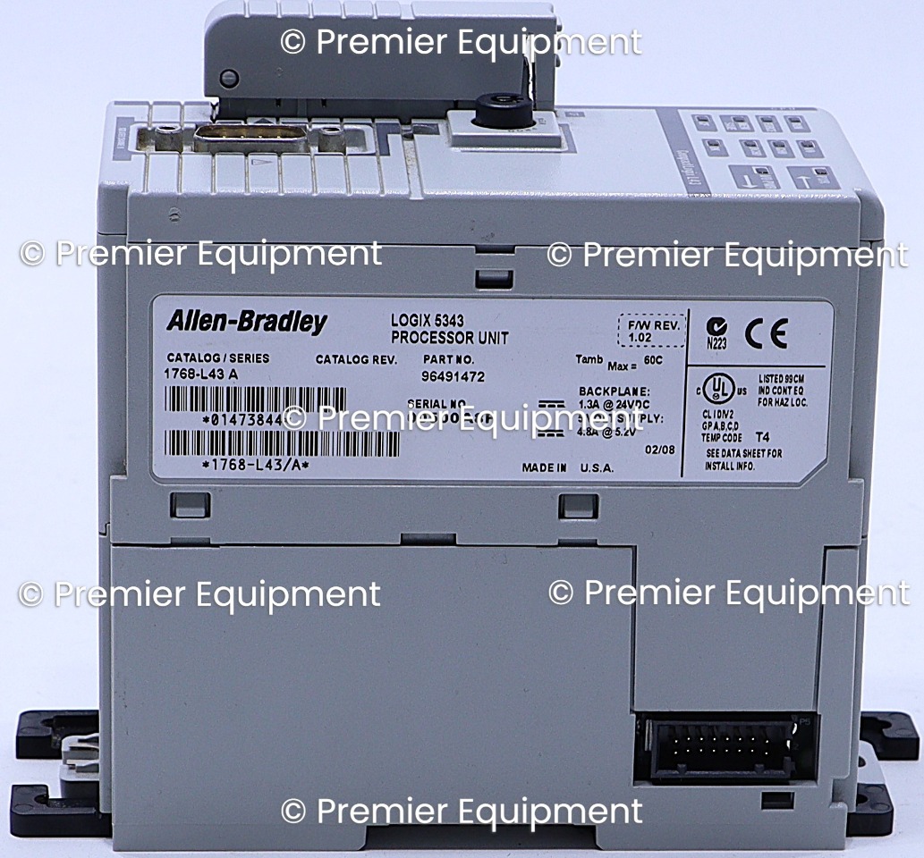 ALLEN BRADLEY 1768-L43 /A LOGIX 5343 PROCESSOR UNIT2.0 MBYTE MEMORY16 TASKS1-PORT RS- 232 SERIAL (DF1 OR ASCII)COMMUNICATION OPTIONS: ETHERNET/IPCONTROLNETDEVICENETSERIAL PORT