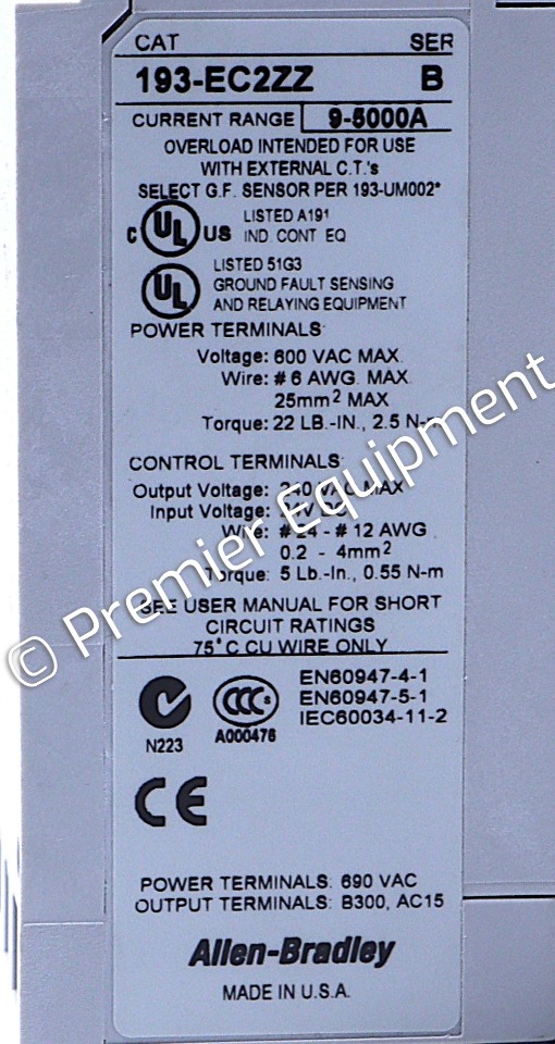 ALLEN BRADLEY 193-EC2ZZ SER B SOLID-STATE OVERLOAD RELAYE3 PLUSINTERNAL GROUND FAULT SENSING9-5000 AMP RANGECOMES IN NON-FACTORY BOX