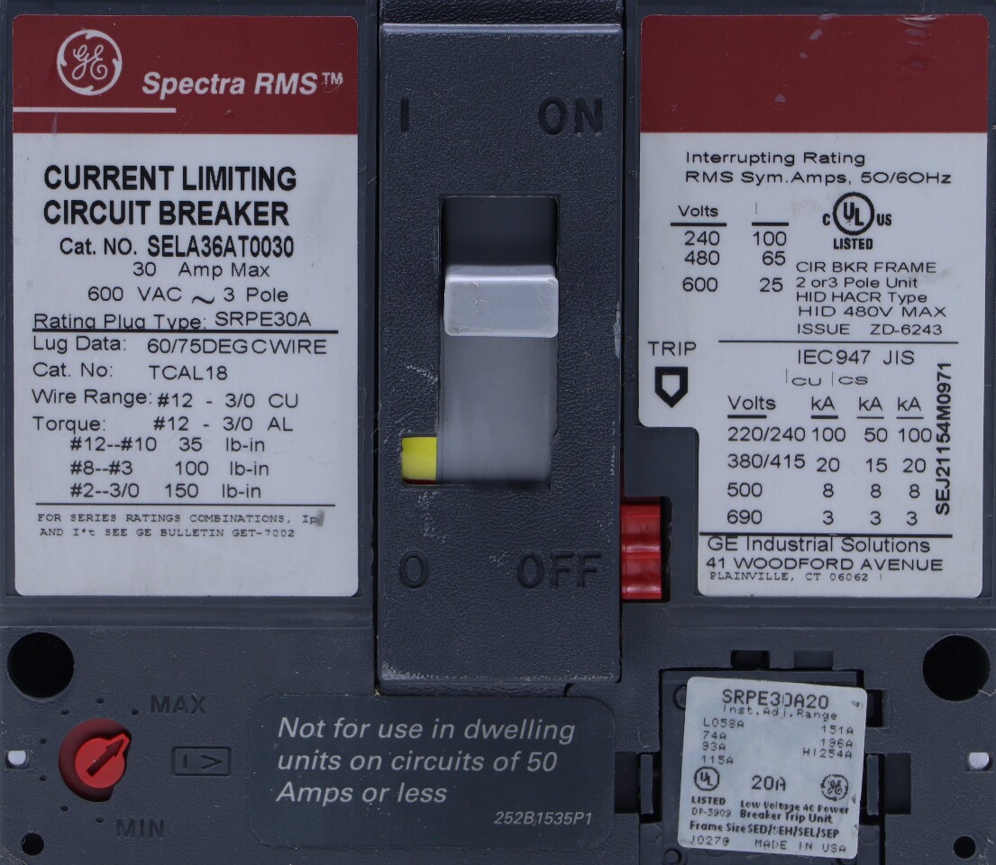 * GE SPECTRA RMS SELA36AT0030 30A CURRENT LIMITING CIRCUIT BREAKER