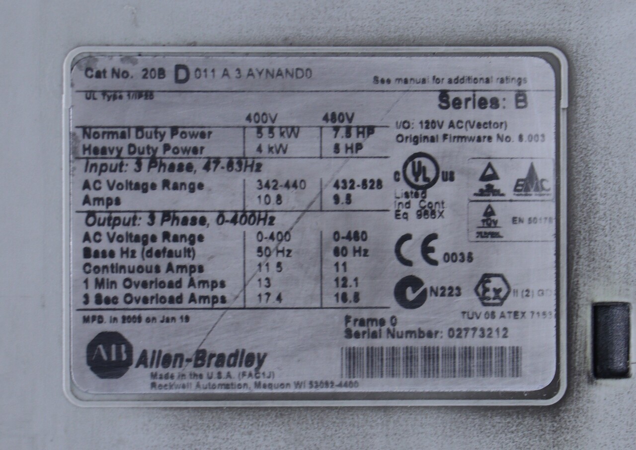 * ALLEN BRADLEY 20BD011A3AYNANDO SER B VARIABLE FREQUENCY DRIVE *READ*