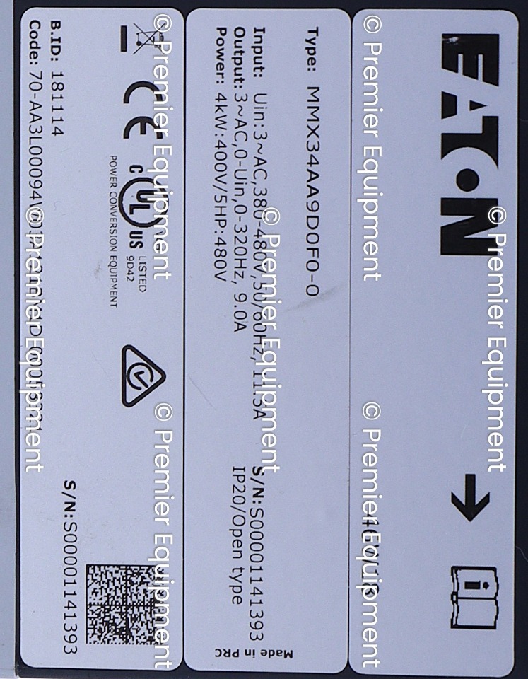 Input: 3 ph, 380-480V, 50/60hz, 11.5AOutput: 3 ph, 0-320Hz, 9.0APower: 4kW 5HP 480V