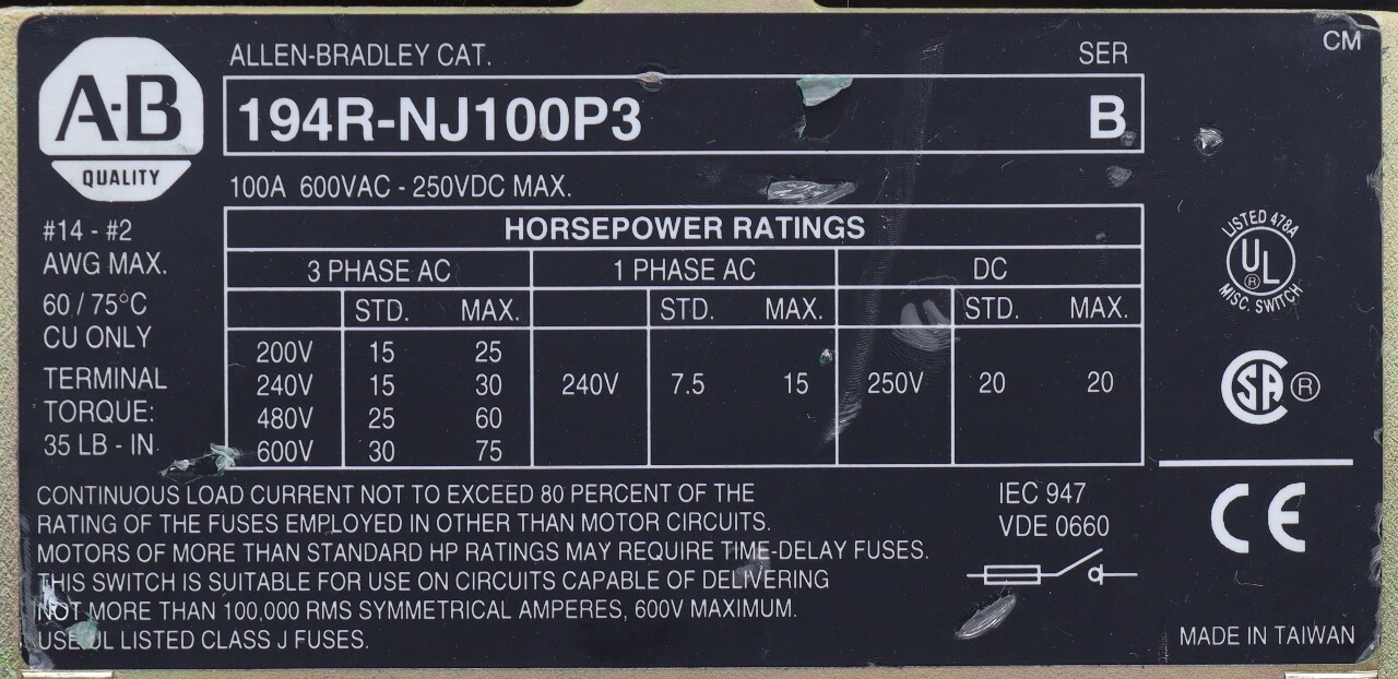 ALLEN BRADLEY 194R-NJ100P3 3 POLE SER B FUSED DISCONNECT SWITCH