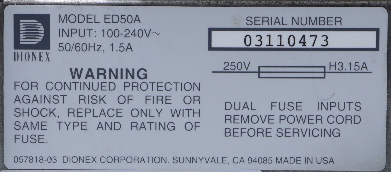 DIONEX MODEL ED50A 100-240V 50/60Hz 1.5A ELECTROCHEMICAL DETECTOR