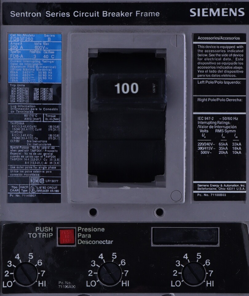 * SIEMENS SENTRON SERIES FD63F250 SERIES B 100A CIRCUIT BREAKER TESTED