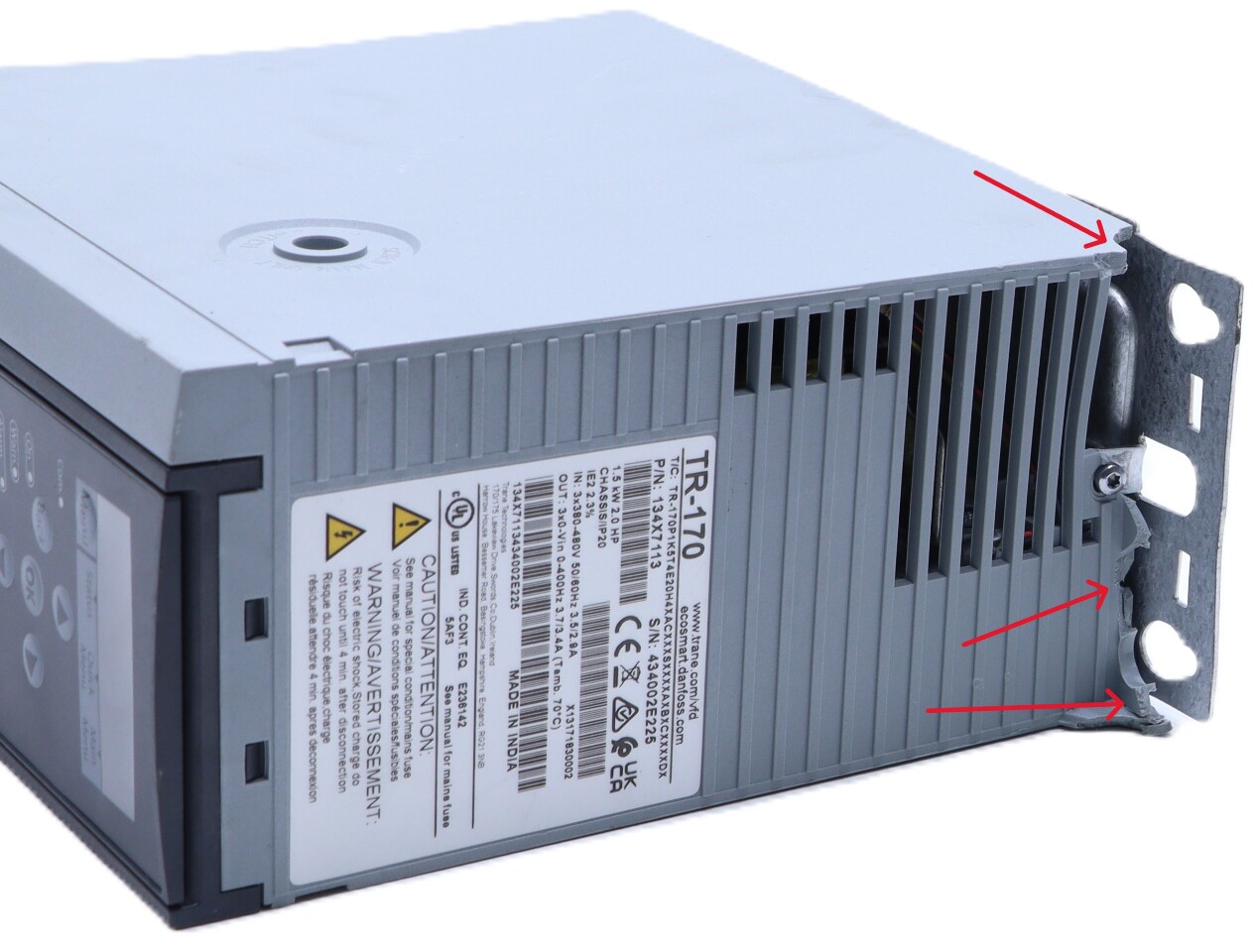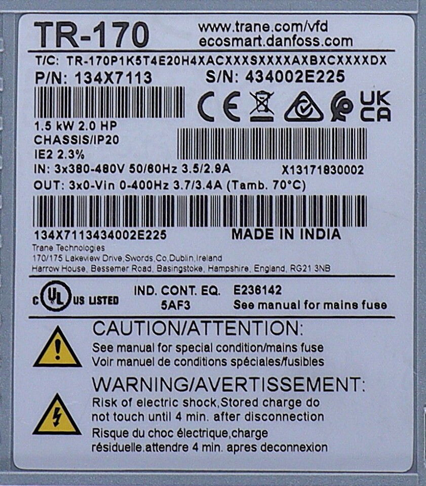 VARIABLE SPEED DRIVETR1701.5 KW2.0 HPIN 3X380-480 VAC50/60 HZ3.5 / 2.9 AMPSOUT 3X0-VIN0-400 HZ3.7 / 3.4 AMPSLast pictures shows some breaks in plastic