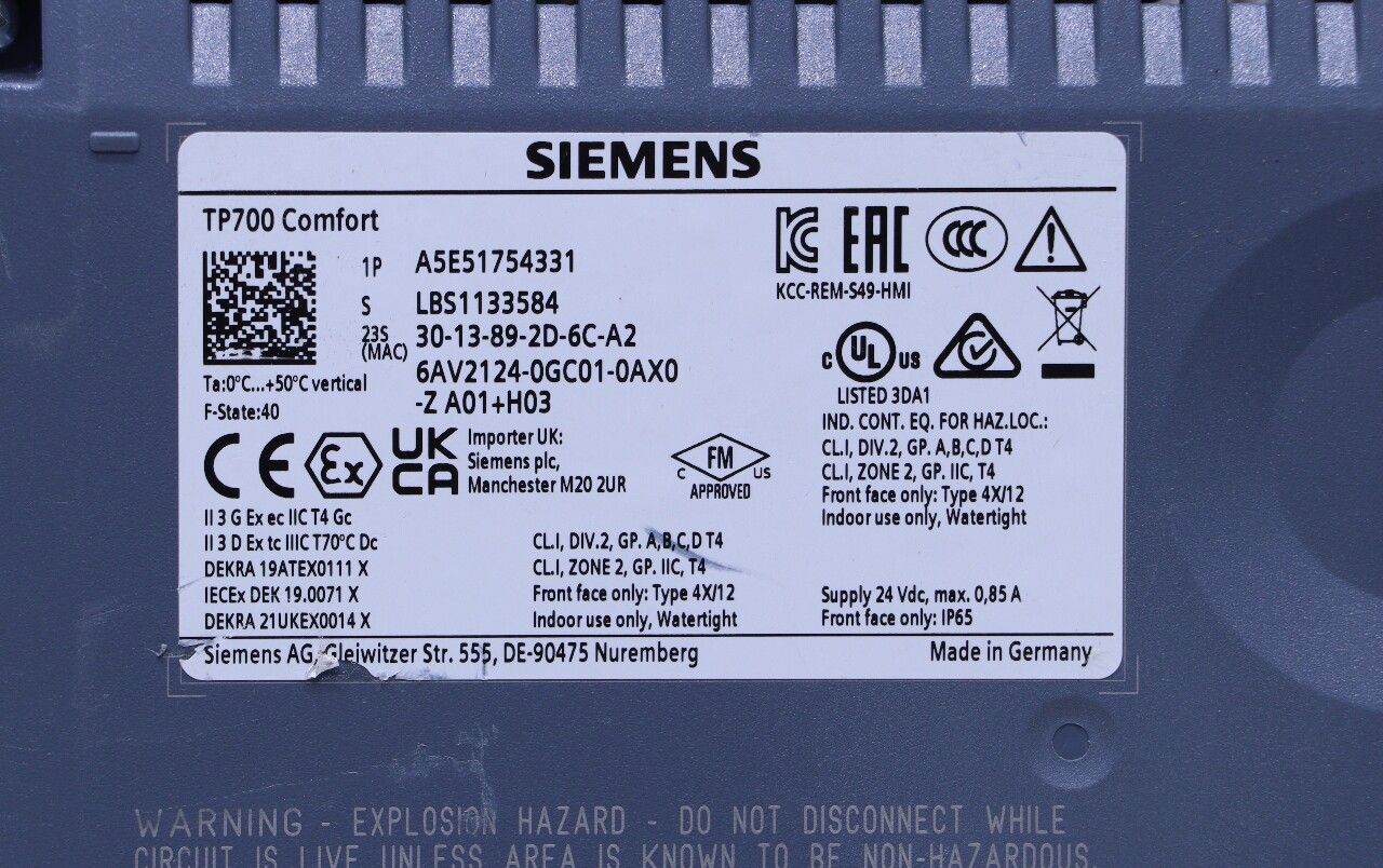 * SIEMENS TP700 6AV2124-0GC01-0AX0 OPERATOR INTERFACE TOUCH PANEL