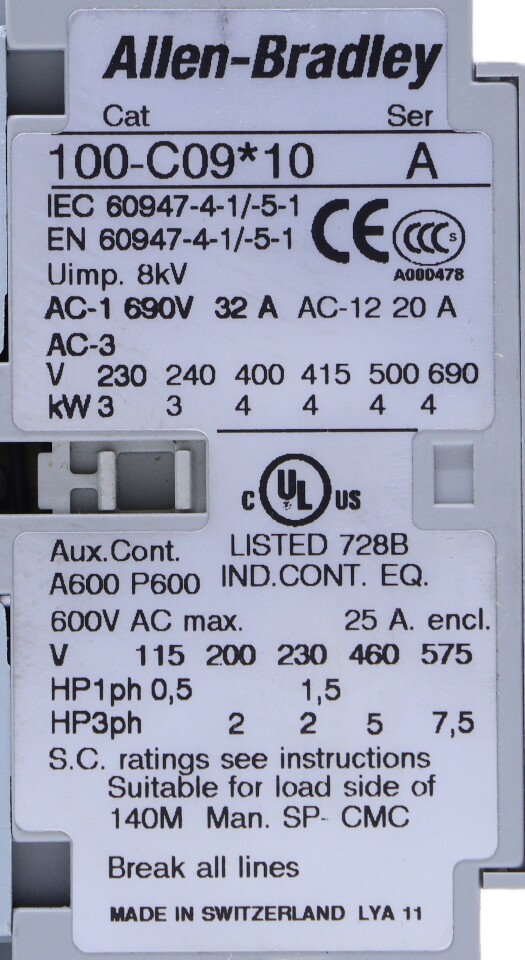ALLEN BRADLEY 100-C09*10 SER A 100-C09D10 110-120V 50-60HZ