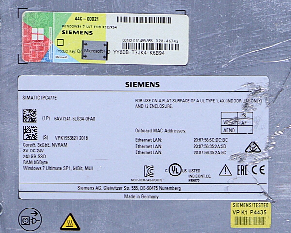 SIEMENS SIMATIC HMI 6AV7241-5LG34-0FA0 IPC 477E. 22" MULTITOUCH PANEL PC
