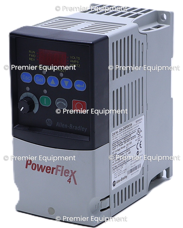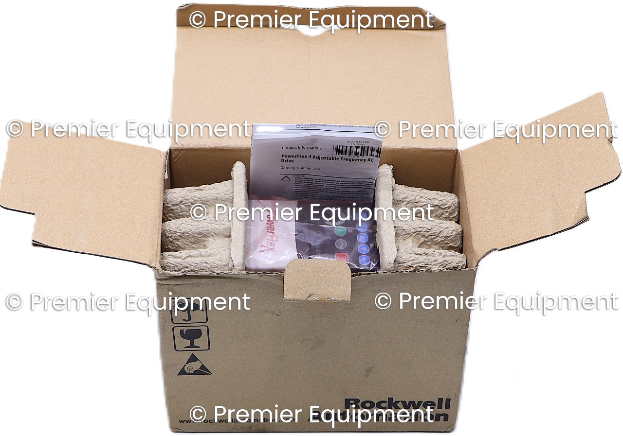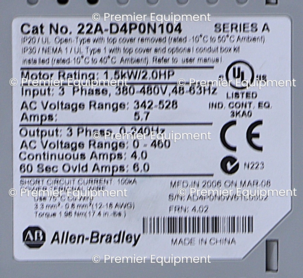 Attention: Factory box label is for the same catalog number but different mfg date.ALLEN BRADLEY 22A-D4P0N104 /A POWERFLEX 4 2HP AC DRIVEADJUSTABLE FREQUENCYFirmware 4.024 AMP3 PHASE480 VAC1.5 KW / 2 HP