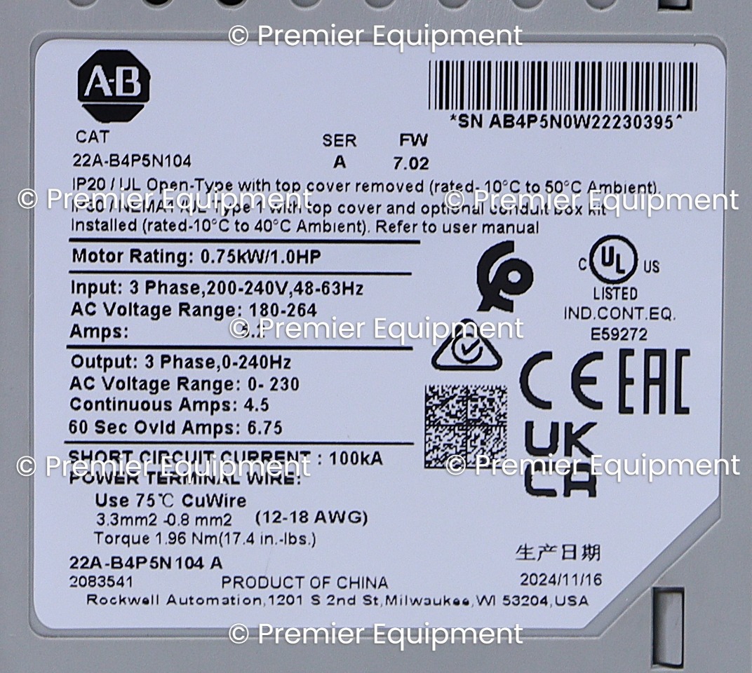 ALLEN BRADLEY 22A-B4P5N104 SER A FW 7.02 POWERFLEX 4 AC DRIVE