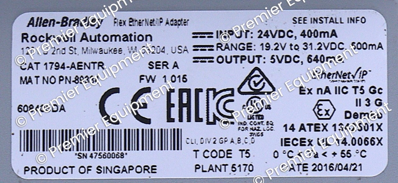ALLEN BRADLEY 1794-AENTR SER A FW 1.015 FLEX ETHERNET/IP ADAPTERINPUT: 24 VDC 400 MA OUTPUT: 5 VDC 640 MA RANGE: 19.2-31.2 VDCCOMES IN NON-FACTORY PACKAGING