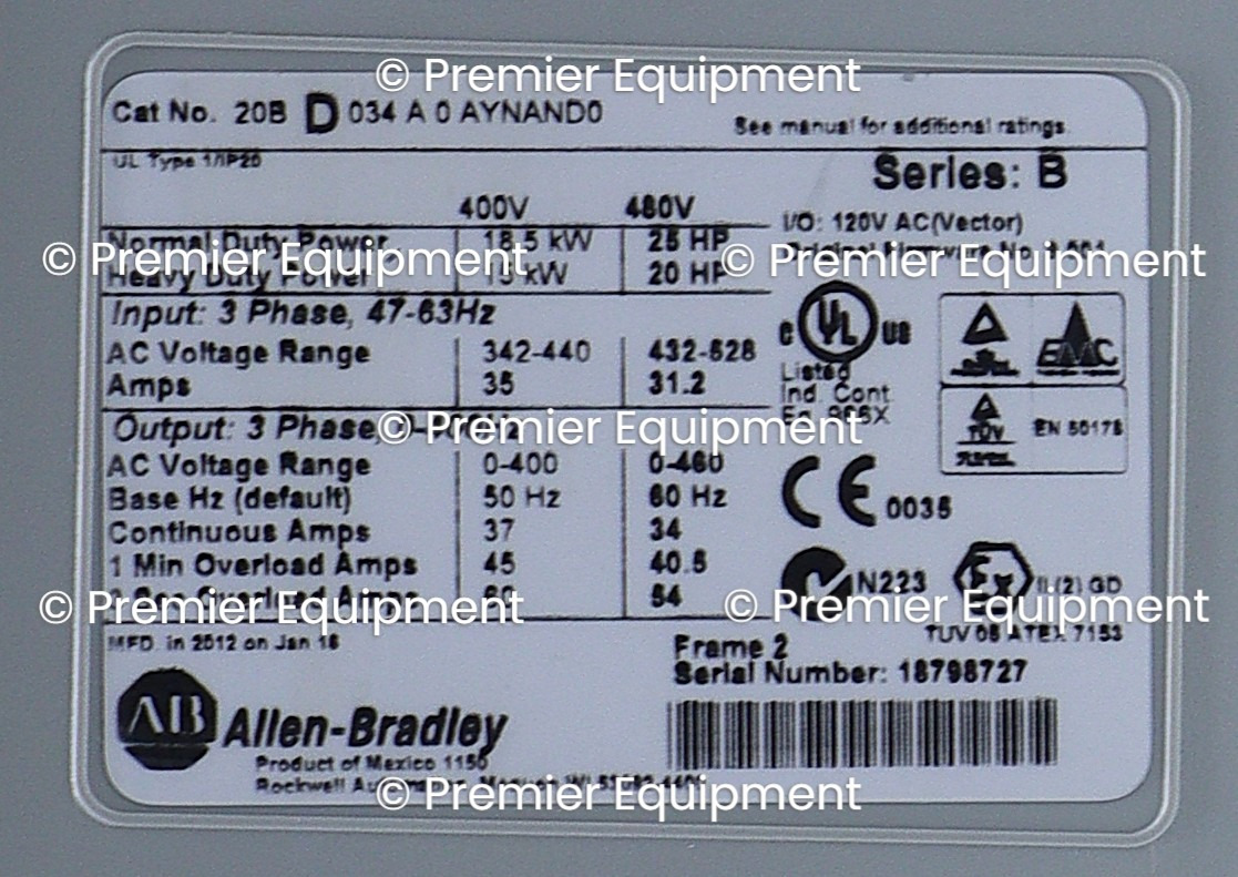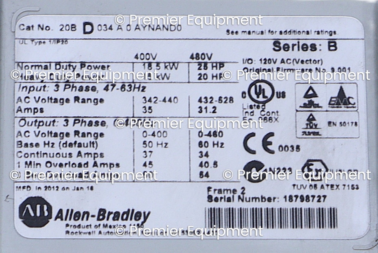 ALLEN BRADLEY 20BD034A0AYNAND0 POWERFLEX 700 25 HP AC DRIVESER B FRN 9.001AIR COOLED480 VAC60 HZ3 PHASE34 AMP25 HPFRAME 2