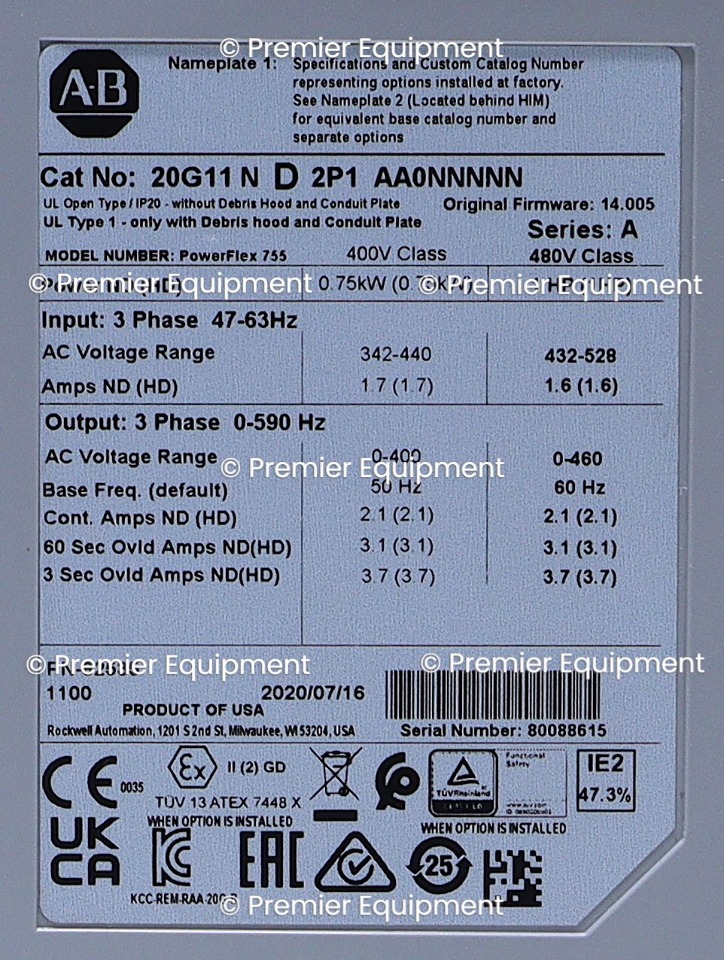 ALLEN BRADLEY 20G11ND2P1AA0NNNNN POWERFLEX 755 AC DRIVE3HP