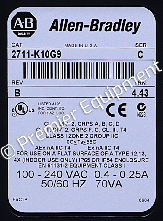No factory label on the boxSer C, Rev B, FRN 4.43PANELVIEW STANDARDKEYPADPANELVIEW 100010 INCH DISPLAY640 X 480 PIXELSRS-232 (DH-485)PRINTER PORT100-240 VAC INPUT50/60 HZ